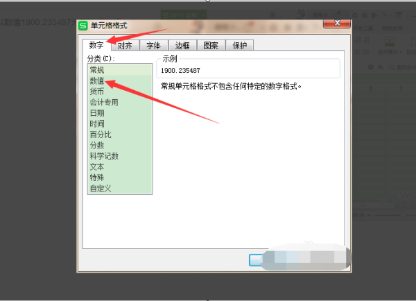 3、弹出单元格格式窗口,默认选择数字选项卡,其中点击数值。