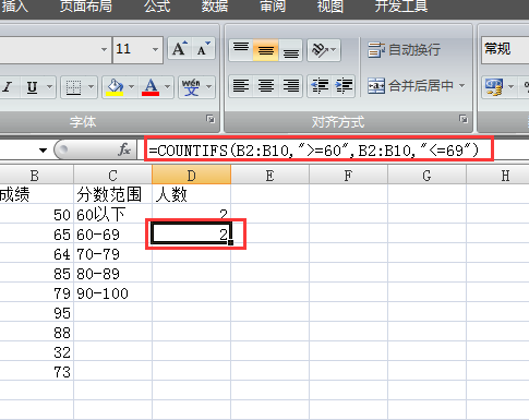 三、要在D3中统计“60分—69分”的人数,输入公式“=COUNTIFS(B2:B10,">=60",B2:B10,"<=69")”即可统计出来。