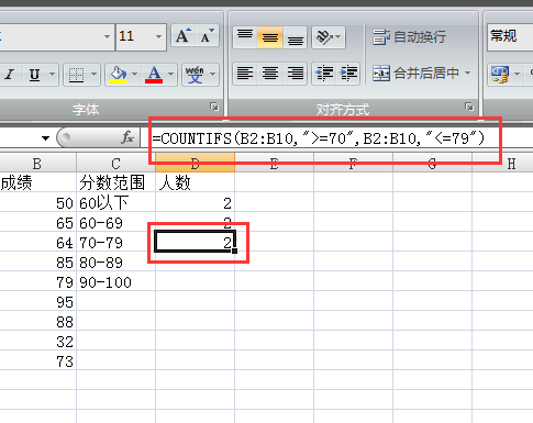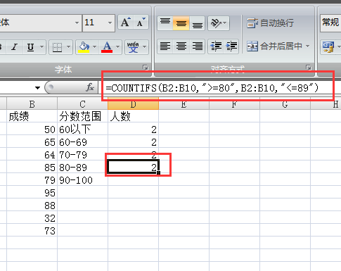 五、D5单元格统计“80—89”使用公式“=COUNTIFS(B2:B10,">=80",B2:B10,"<=89")”。