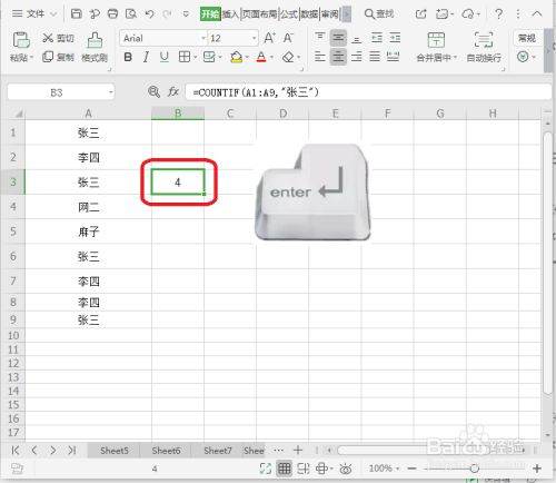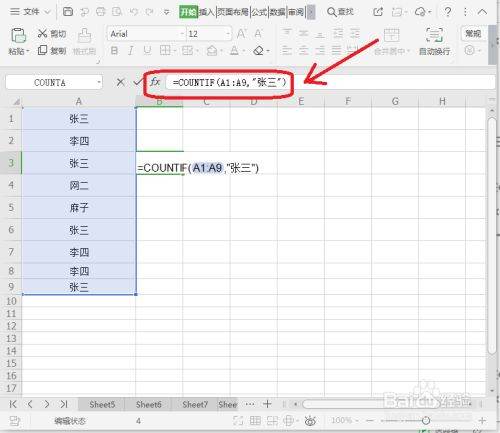 第一步:选择一个单元格,然后在fx中输入公式:=COUNTIF(A1:A9,"张三"),公式说明:A1:A9为查找区域,“张三”为查找条件,如下图所示。
