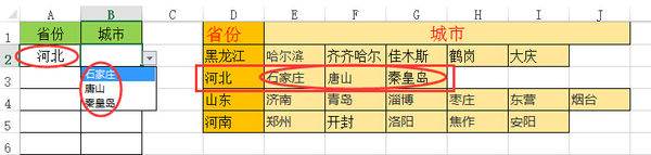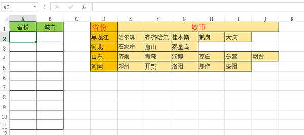 制作数据源表格:比如一级菜单为省份,二级菜单为城市,可以将表格制作为下图这样的