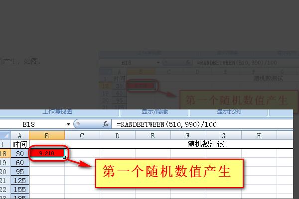 2、选中区域内的第一个单元格,在编辑栏内输入公式:=RANDBETWEEN(510,990)/100,回车即可。
