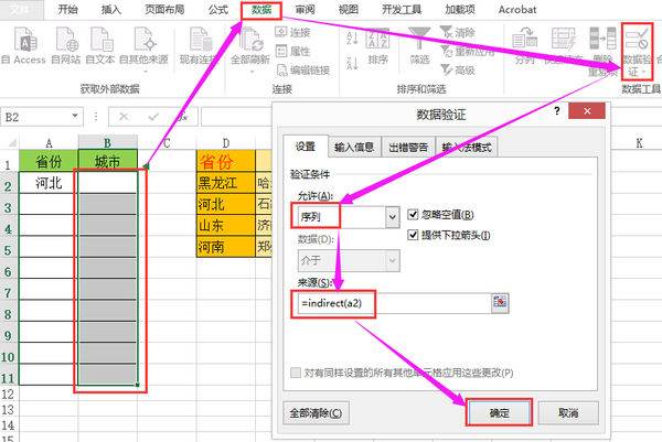 制作二级下拉菜单(城市):操作与第4步基本相同,选中B2:B11区域后打开数据验证,序列,来源不同了,用公式=indirect(a2) 注意这个A2需要相对引用。