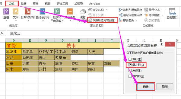自定义名称:将各省份的城市定义为本省名称,点击工具栏上的“公式”选项卡,在自定义名称区域点击“按所选内容创建”,选择最左列,确定。