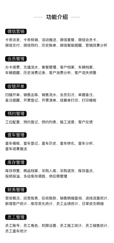 汽修管理软件是专门为汽修厂、汽车美容等行业开发的产品,随着互联网+和社交平台的兴起,现在传统的CRM软件逐渐变SCRM软件替代,管理软件和微信营销相结合,更好的服务客户和提高客户粘性,汽修行业也一样,拾车道汽修管理软件提供参考筛选,可以借鉴一下: 1、配件管理: 包括:配件销售,采购管理,库存浏览,库存盘点,出库查询,内部领料 2、报表统计: 包括:业务报表,提成统计,库存统计,坏账统计,项目类别统计 3、市场推广: 包括:潜在客户管理,客户发展 4、维修管理: 包括:维修开单,业务调度,领料退料,报价跟踪 5、财务管理: 包括:财务收款,财务付款,往来对账单,流水账,连锁收款,连锁付款,连锁汽车管理系统软件有哪些功能?
