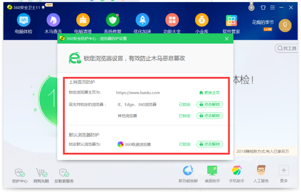 这个是需要用安全软件锁定的,不然还是会被恶意软件或者非而且软件不通知的情况下直接更改首页的。可以打开安全软件---工具箱---浏览器保护---输入你需要设置为主页的网站---锁定就好了。大部分安全软件都是这样设置的,当然也有一些差异,但是都是大同小异的。另外,建议楼主使用QQ浏览器,该浏览器体积小,打开网页速度很快的,而且支持屏蔽广告。也建议楼主养成定期清理病毒laji的好习惯。相关文章