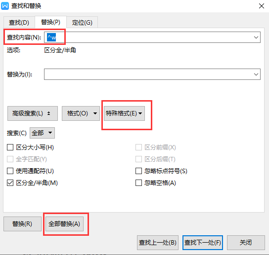 2、按住Ctrl+H,打开“查找和替换”,在查找内容处输入“^w”,特殊格式选择“空白区域”,点击“全部替换”即可~