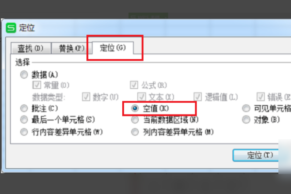 3、进入定位界面,点击“定位”选择“空值”点击定位。