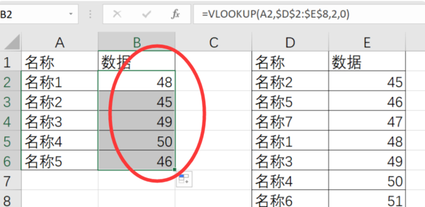 4、点击确定或者回车按键即可得到对应的数据,下拉公式就可以根据A列和D列的关键字提取出E列的数据填充到B列中,两个不同的单元格已经联系起来。