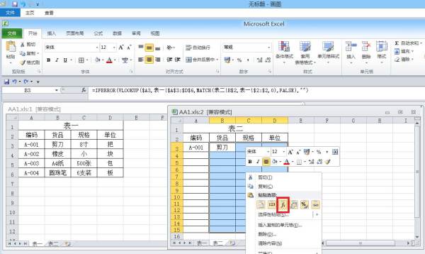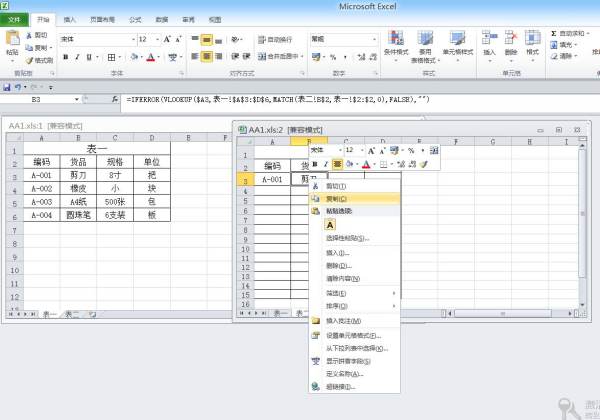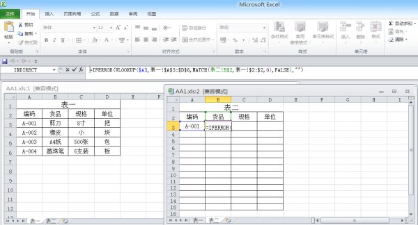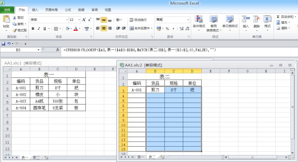 =IFERROR(VLOOKUP($A3,表一!$A$3:$D$6,MATCH(表二!B$2,表一!$2:$2,0),FALSE),"") 回车;