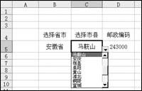 10.以后需要查询邮政编码时,可以这样操作:选中B5单元格,此时在该单元格右侧会出现一个下拉箭头,单击此下拉箭头,在随后出现的下拉列表中,选择对应的名称(如“安徽省”);再选中C5单元格,选择对应的市、县名称,相应的邮政编码就会立刻出现在D5单元格中。