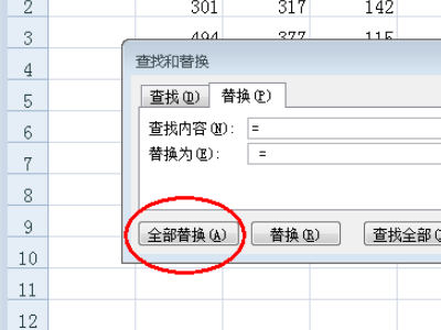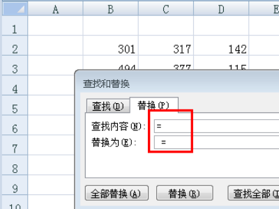 4、在查找内容中输入“=”,然后在替换内容中输入“ =”<空格+=>。