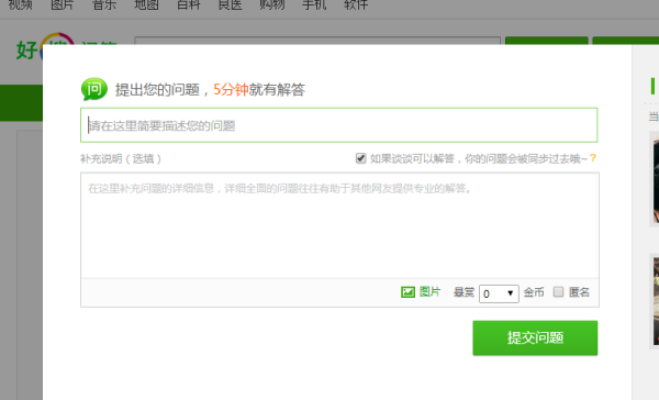 3、点击【我要提问】后会弹出新的对话框,见下图,在新的对话框上面的空白栏中输入想要问的问题,下面比较大的空白框是对问题的进一步描述,可以填写,也可以不填写。