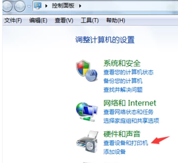 2.打开控制面板,找到硬件和声音,点击下面的查看设备和打印机。