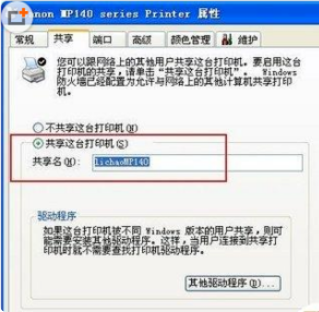 3、在弹出窗口中我们选择“共享”然后“共享这台打印机”,并起个共享名“lichaoMP140”,然后确定;;