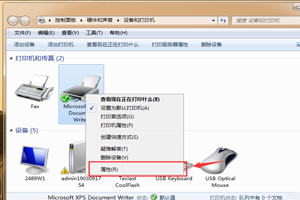 6、然后在进入的界面,如果有多个设备,选择好自己打印机这个设备,一般会有错误提示,点击【属性】,