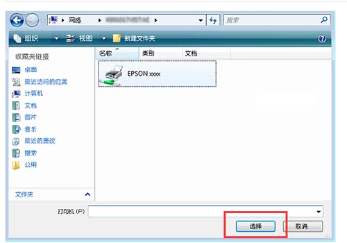 4、这时会出现网络上共享的打印机,点击这个打印机,再点击选择。
