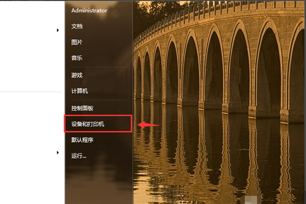 2、在打开的开始菜单里面,点击右侧的【设备和打印机】选项,