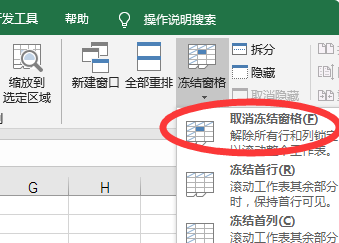 3、然后在“视图选项卡”中找到“冻结窗格”选项,点击打开下拉菜单即可看到“取消冻结窗格”。