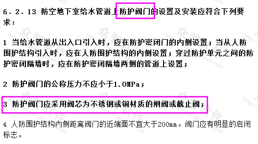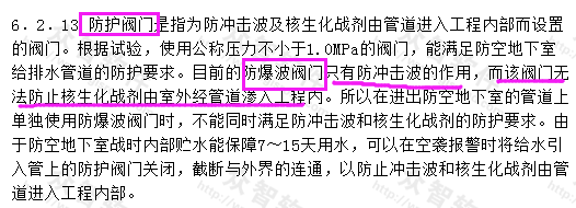 根据现行《人民防空地下室设计规范》(GB 50038—2005)第6.2.13规定,所有穿人防顶板、侧壁以及防护单元之间的隔墙的给排水管、消防管需在人防内侧设铜芯闸阀(Pn≥1.0MPa)及防密套管,而不仅仅是防爆波阀。