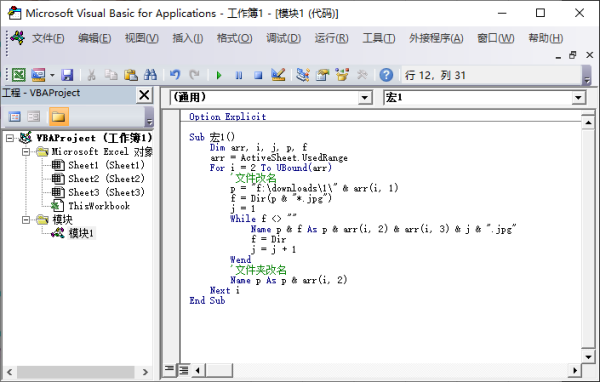 既然数据在EXCEL里面,用VBA来写是顺理成章的,VBA的好处是代码在EXCEL文件里面,比较友好的开发和调试环境,可以单步一行一行的执行代码,中途可以查看变量的值,便于更正程序,我初步写了一个VBA代码,方法是把文件另存为XLAM格式(带脚本的文件),按ALT+F11进入VBA环境,按CTRL+R打开工程管理器,插入模块,粘贴代码,如下图: