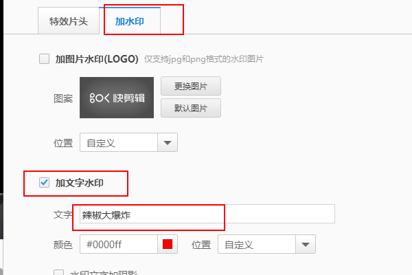 3、在弹出的窗口中,选择上方的加水印,需要增加图片水印的就勾选下方加图片水印前面的小方框,加文字水印的就在下方加文字水印前的小方框打钩,并输入水印文字。