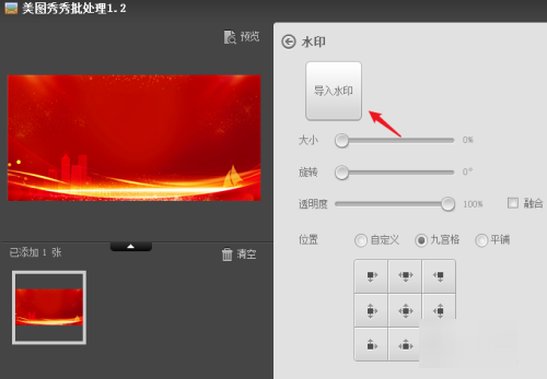 打开美图秀秀应用,点击批处理的图标。选择添加多张图片的选项,选定需要添加水印的照片。点击水印的图标,选择导入水印的图标。调整水印的位置后,点击确定的选项。添加水印后,点击保存的选项即可。
