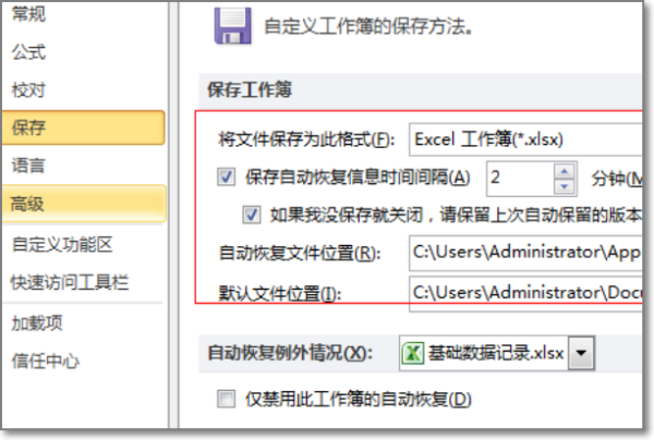 3,找到保存选项,然后就可以看到自动保存文件存在的地址,把这个地址复制到地址里栏里面直接打开就可以找到刚才丢掉的文件。