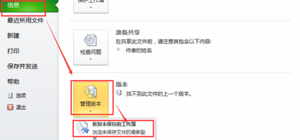 3、在打开的文件菜单中选择“信息”——”管理版本“——“恢复未保存的工作薄”