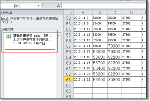 1,如果在做Excel的过程遇见突发情况忘记保存文件,那么不要担心,再次打开这个文件时会有提示,只需要点击恢复文件即可。