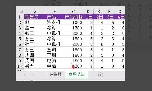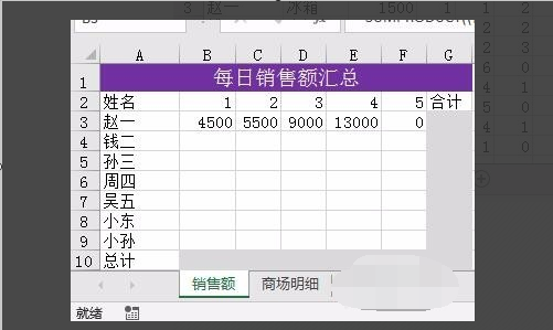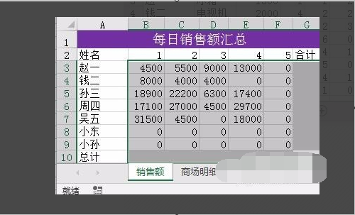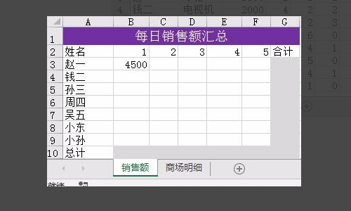 2、新建一个工作表,制作销售金额汇总样式,要求能够根据明细报表,统计出每日每个业务员的销售额总量
