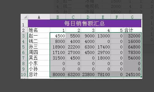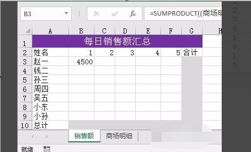 4、点击B3,而后向右拖动公式,就获取了第一个人每日的销售额汇总