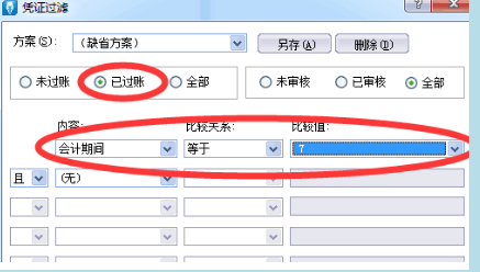 5、进入“凭证过滤”窗口,选择已过账凭证,再选择内容“会计期间”、比较关系“等于”、期间月份,即可查询看以前年度数据。