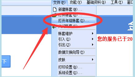 2、登录进去后选择最上方的“文件”,再选择“打开年结账套”,如图所示:
