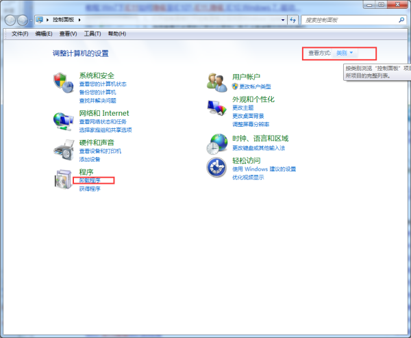 1,打开控制面板,查看方式选择“类别”,在选择“卸载程序”