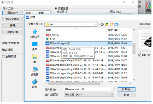 2.在“批处理”界面,点击 “添加文件”,进入“打开”弹窗,在弹窗中找到需要转换格式处理的CAD图纸文件,再点击“打开”按钮。
