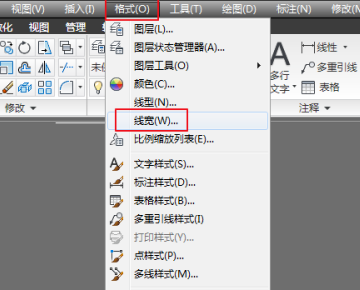 2、然后选择“格式”菜单,列表中选择“线宽”,如下图所示。