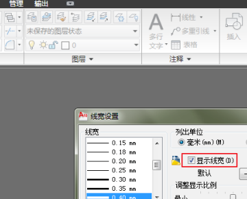 3、然后在打开的话框中找到“显示线宽”并勾选,点“确定”,如下图所示。