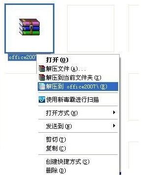 2、将Office2007 安装包解压。选中Office2007这个压缩包,右击鼠标,在快捷菜单中选择“解压到 Office2007”.