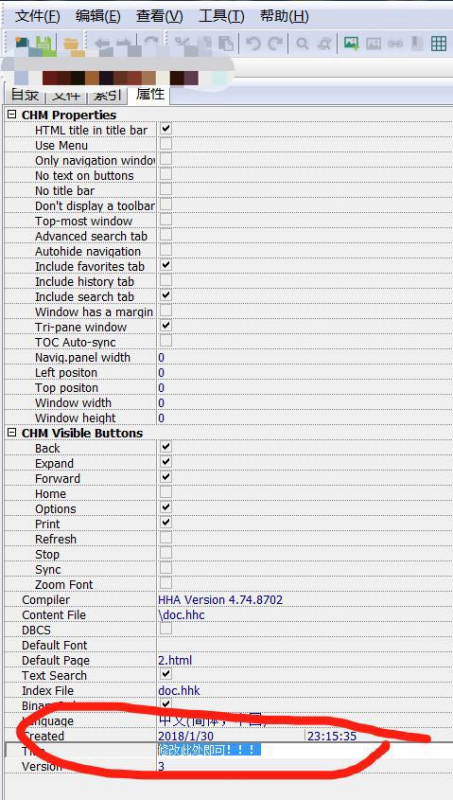 打开CHM Editor,再打开你想要修改标题的chm文件,点击“属性”,再Title里修改名称即可!