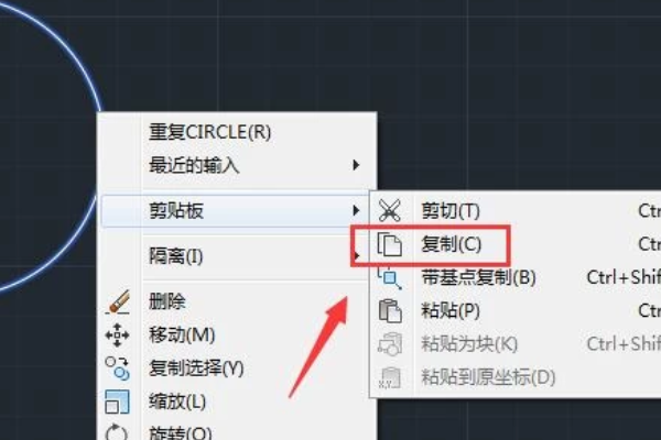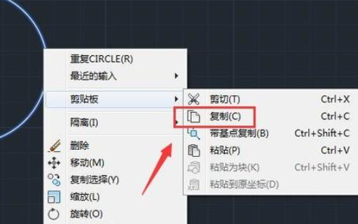 3、选择绘制的圆形单击鼠标右键在弹出的右键菜单里找到剪贴板选项,点击该选项在其内找到复制选项。