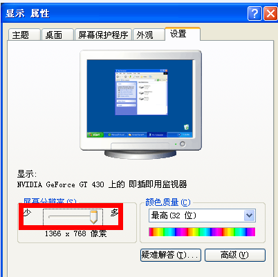 2、在显示属性窗口,选择“设置”,在“屏幕分辨率”框通过鼠标左右拖动调解分辨率,完成后点击“应用”“确定”。