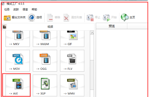 1、在格式工厂的首页选择您想要更改的视频格式。以AVI格式为例,点击“AVI”。