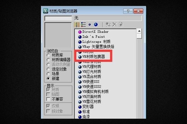 2、其次,完成上述步骤后,选择“VR材质包裹器”选项,单击“确定”(安装并打开虚拟现实渲染插件后将显示此材质),然后继续进行下一步,如下图所示。