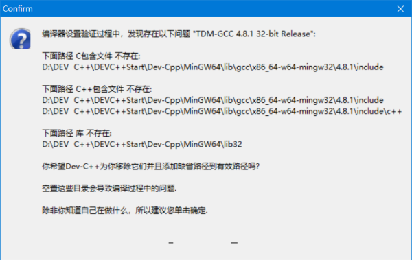应该是没有正确配置MinGW GCC工具集,有两个版本的Dev-C++安装包,一个是自带并配置好GCC的,另一个只是IDE没有编译器工具集,后者需要手工在Dev-C++的目录下建立MinGW32或/和MinGW64目录,然后把另外下载的MinGW放进去,根据32bit/64bit不同的版本,然后在Dev-C++里编译器配置里点自动寻找编译器,它才能自动发现并配置好新安装的devc++ 打开就提示下面这些 请问是什么意思 该怎么解决啊