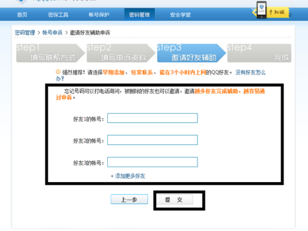 7、接着你可以向你的QQ好友发出邀请,帮助你申诉,按照提示选择符合条件的好友,然后点击提交等候结果就可以了。