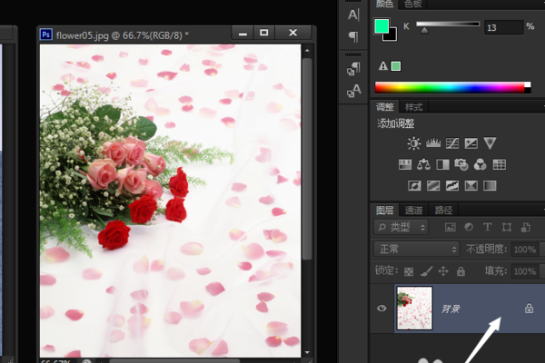 5、点击作为背景图层的图片(左边),图层调板中显示锁定的背景层;