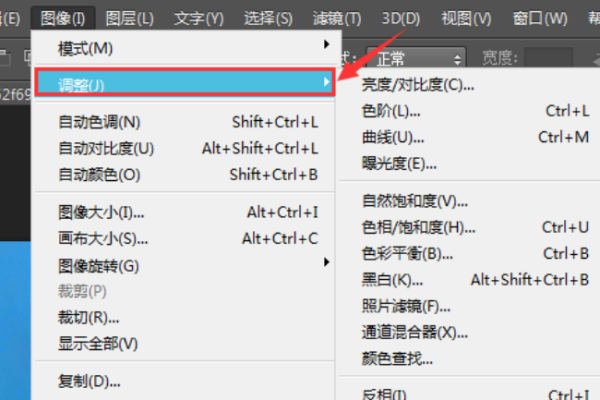 二、然后,在ps cs6程序主界面上方点击“图像”然后点击子菜单中的“调整”,点击打开。