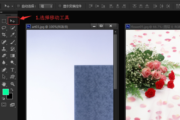 7、点击左边玫瑰花图片拖动,看到露出了作为背景层的图片,说明已经把两张图片打开为同一背景两个图层。
