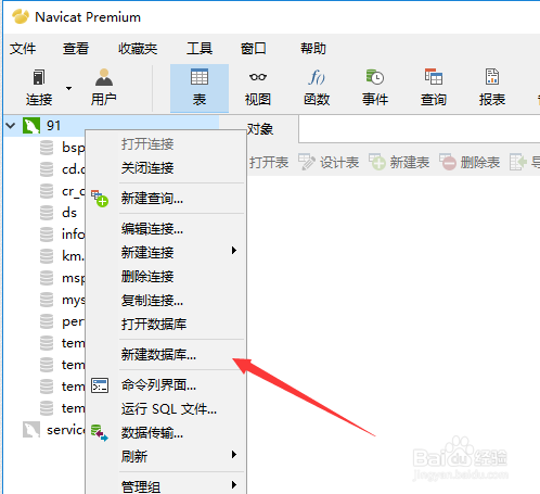 双击打开数据库连接(连接时候的备注名称),因为可以同时连接多个数据库,所以需要连接哪个数据库需要双击打开。默认左侧是改数据库下面现有的数据库,可以点击右键选择‘新建数据库’创建一个新的数据库表结构。